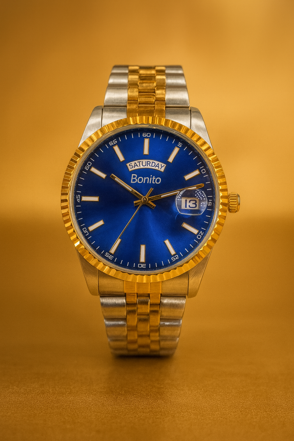 Elegant and reliable, the Bonito Blue Dial Watch features a stunning blue face, day-date window, and a polished two-tone stainless steel strap—ideal for men’s daily wear.