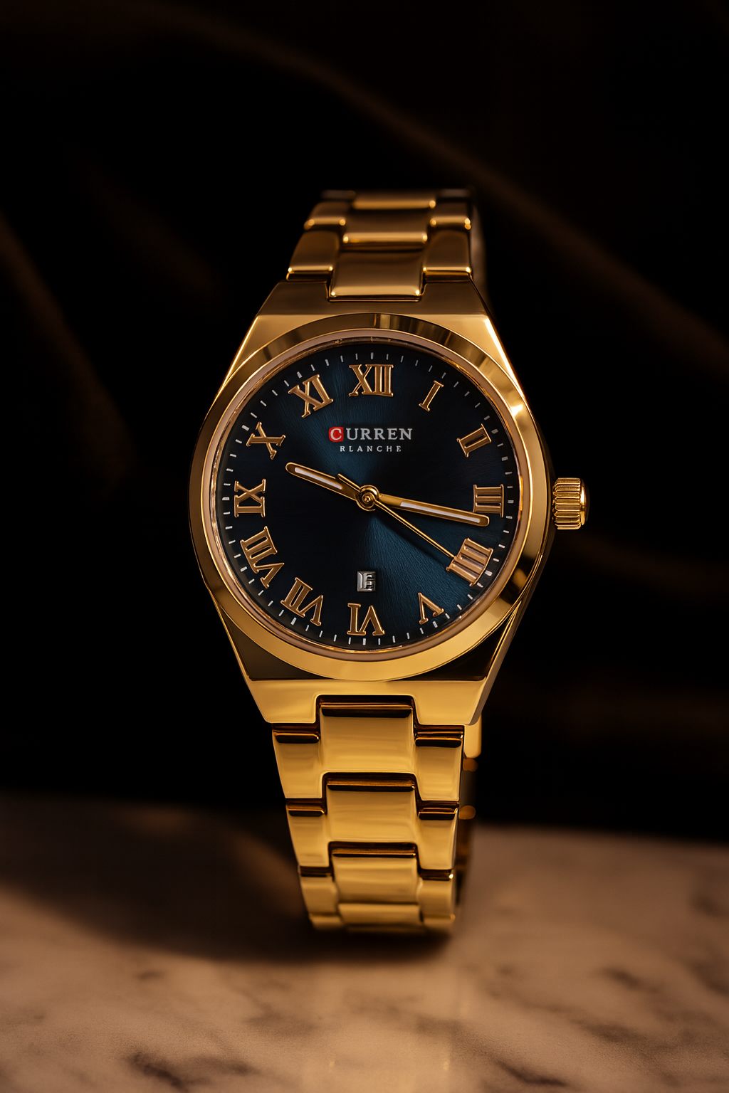 The gold luxury men’s watch from CURREN Blanche radiates refinement and durability. It features a rich gold toned stainless steel band paired with a clear, luminous dial. Also, you’ll notice its sheen at first glance. Moreover, this timepiece suits both dress occasions and everyday wear. Because style matters, the elegant finish stands out without being overdone.